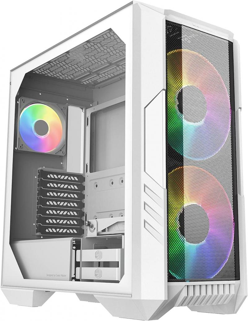 المراوح المدمجة مسبقاً: • الأمام: 2 × 200 مم ARGB • الخلف: 1 × 120 مم PWM ARGB • أعلى “قفص الأقراص”: 1 × 120 مم مروحة موجهة للـ GPU