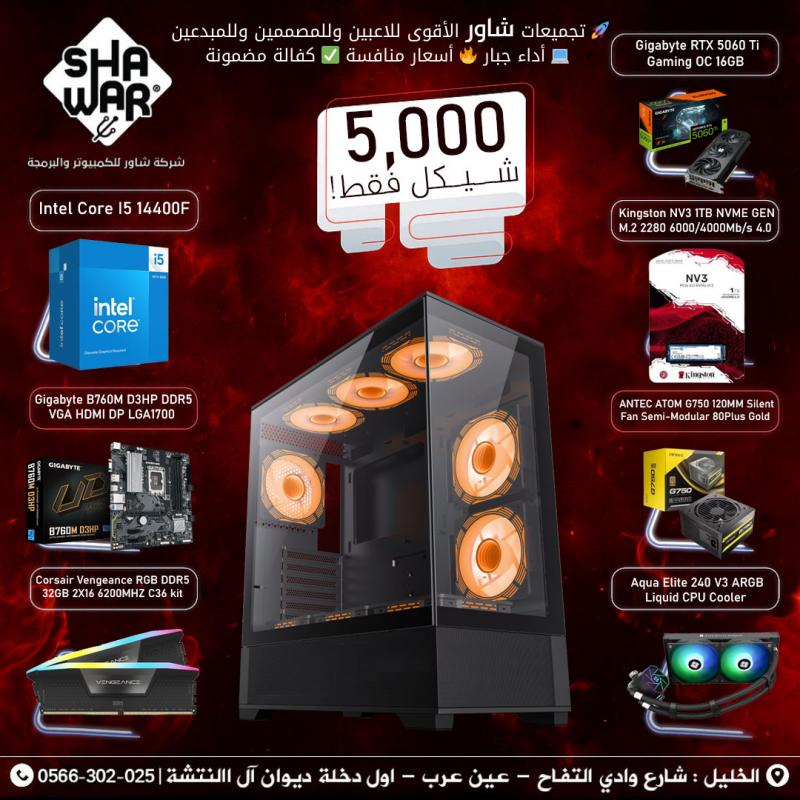 تُعد هذه التجميعة هي الخيار المثالي للبدء بقوة في عالم الألعاب الحديثة بدقة 1080p و 1440p. توازن ممتاز بين معالج Intel Core i5 من الجيل 14 وذاكرة DDR5 السريعة وبطاقة RTX 5060 Ti القوية لتقديم تجربة لعب سلسة وعالية الجودة.